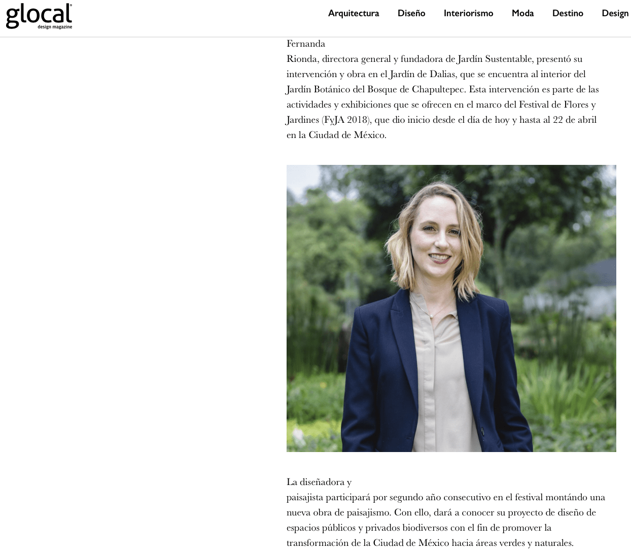 Taller de Ideas RP ha colaborado en distintas etapas con el despacho de diseño de espacios verdes Jardín Sustentable a cargo de su fundadora Fernanda Rionda. Inicialmente, se construyeron los cimientos de comunicación estratégica de la firma y se coordinaron actividades diversas, tales como la participación de la firma en dos ediciones de Design Week México.
